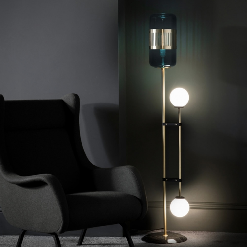 Looking for a piece to add a modern and intriguing flair to your interior scheme? This vintage style floor Lamp is the perfect piece to update your existing design scheme or add some curiosity to your interior. Sophisticated yet unexpected in its design, the lamp juxtaposes a pair of opalescent glass globes with a larger with Peacock Blue glass shade, creating a beautifully eye-catching illumination suitable for any space. The trio of glass shades are supported by geometrically aligned metallic rods, terminating in a solid marble base, only adding to the opulence and character of the piece.